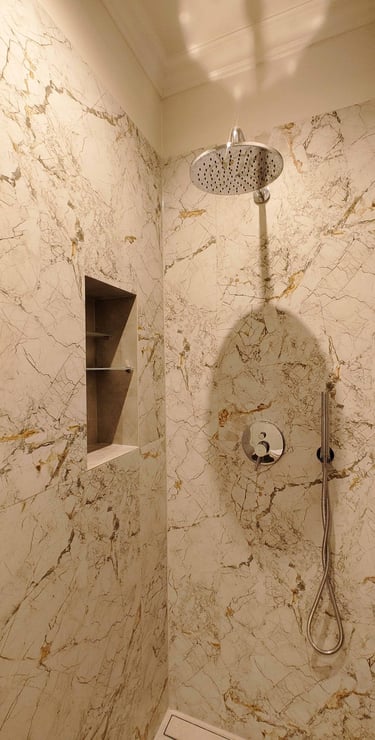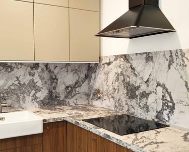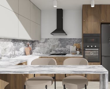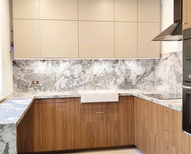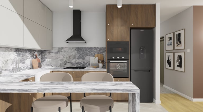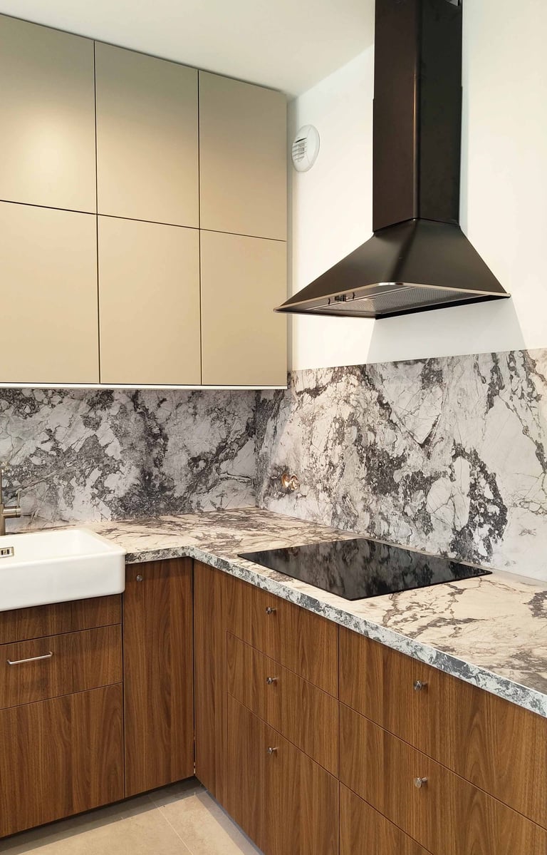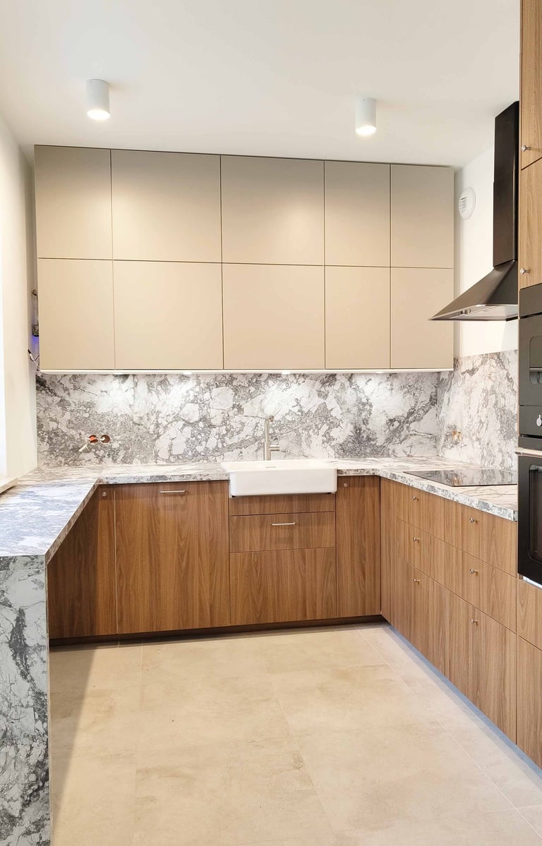 Projekt kuchni to taki trochę taniec, krok do przodu, dwa w tył i jeden w bok. Kilka wersji widziała już ta kuchni, ale narazie wygrała właśnie ta kombinacja frontów IKEA (orzech i beż) a do tego blat z panelem w tym samych wzorze (lodowy marmur).