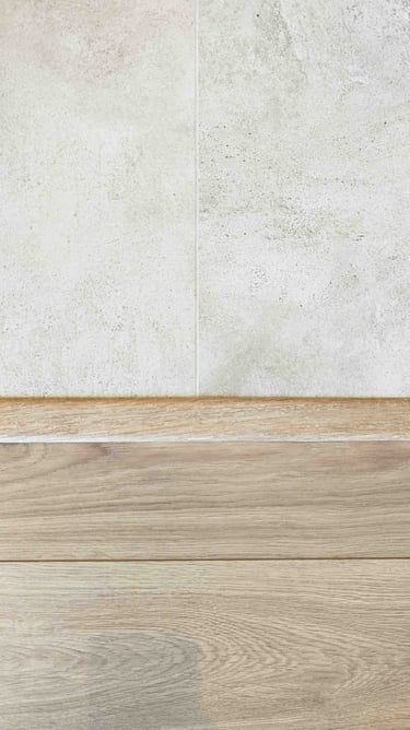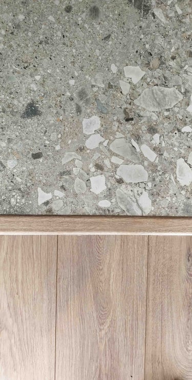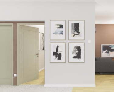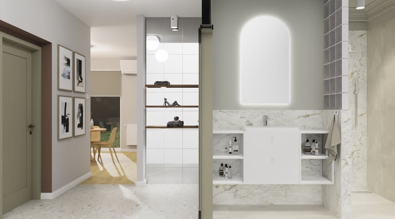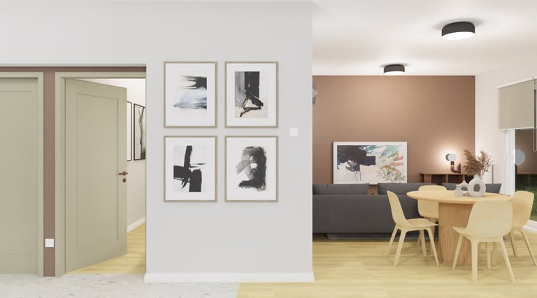 Przedpokój utrzymany został w stonowanych kolorach, beże złamana biel i akcentowy jasny brąz. Wejście do salonu podkreślone jest również zmianą podłogi; z płytek wchodzimy na panele laminowane w kolorze ciepłego dębu.