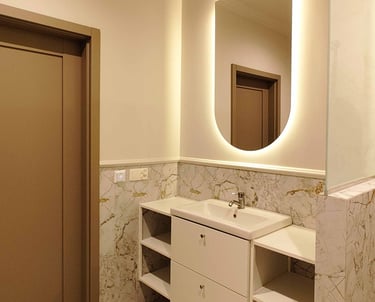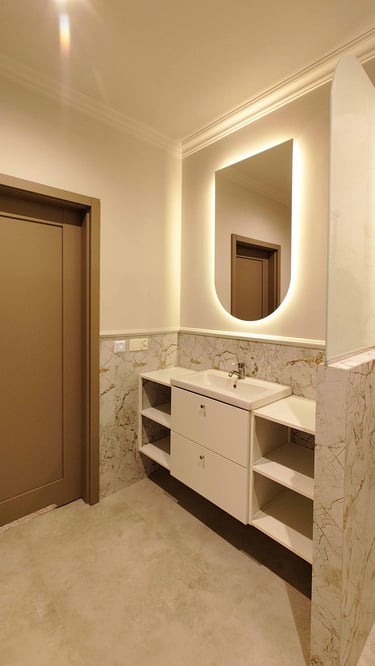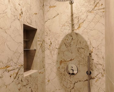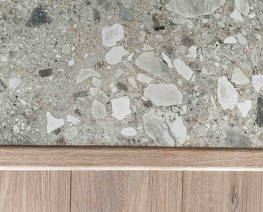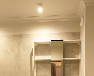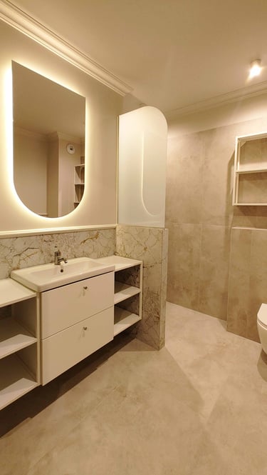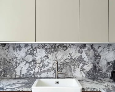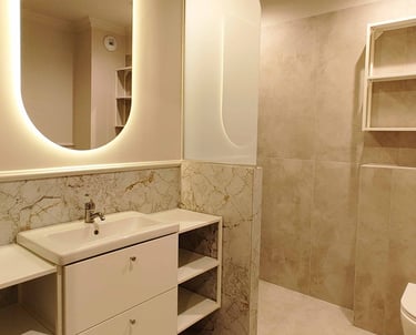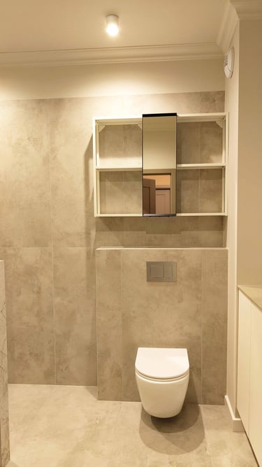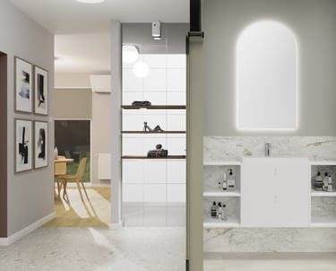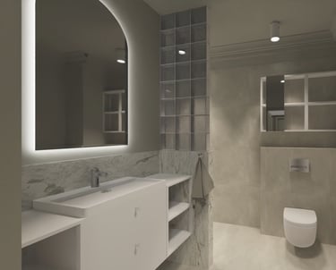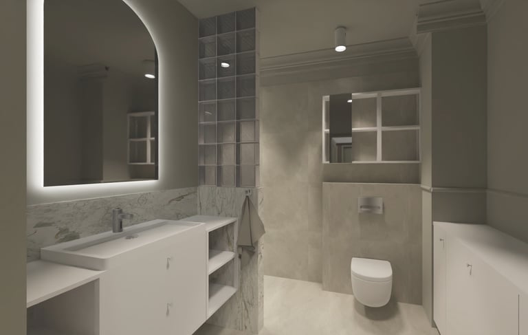Płytki o wzorze Forza na ścianie, ścianka z luksferów i szafki Enhet z IKEA.