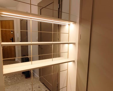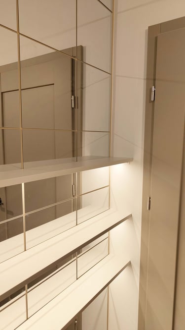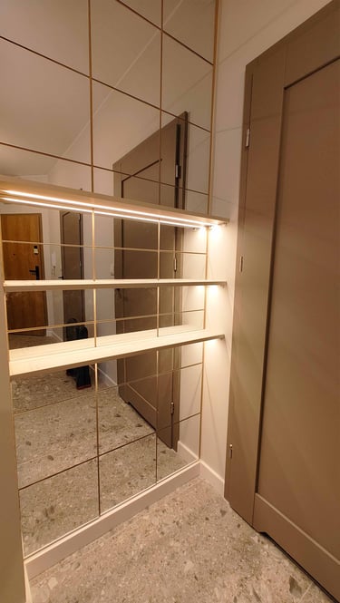 Naprzeciw wejścia do mieszkania zaprojektowana została ścianka wyłożona z małych kwadratowych luster. Taki zabieg powiększa optycznie pomieszczenie.