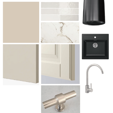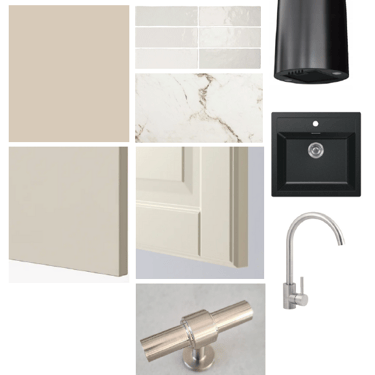 W koncepcyjnych projektach wnętrz (bez realistycznych wizualizacji) używam tak zwanych moodboardów czyli wizualnego zestawienia materiałów, mebli i dodatków aby pomóć w zrozumieniu intencji projektowej i atmosfery danego pomieszczenia.