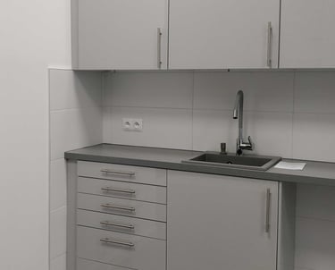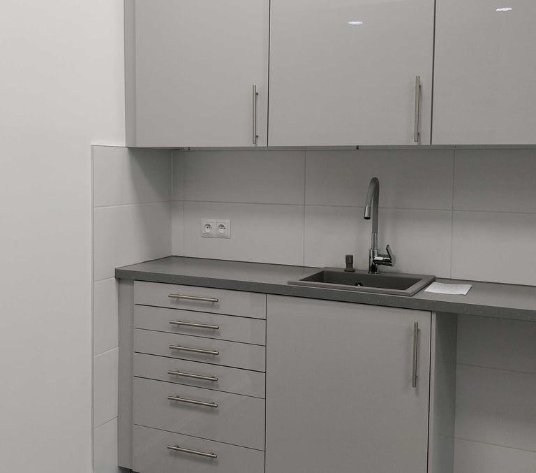 Dominuje biel z szarością. Podłoga w całym lokalu to gres 60x60 z delikatnym wzorem udającym kamień. Szafki zostały zamontowane z szarymi frontami w połysku - wytrzymałe i dającę wrażenie czystości.