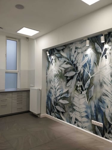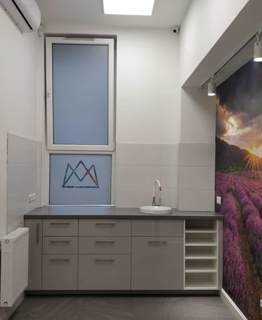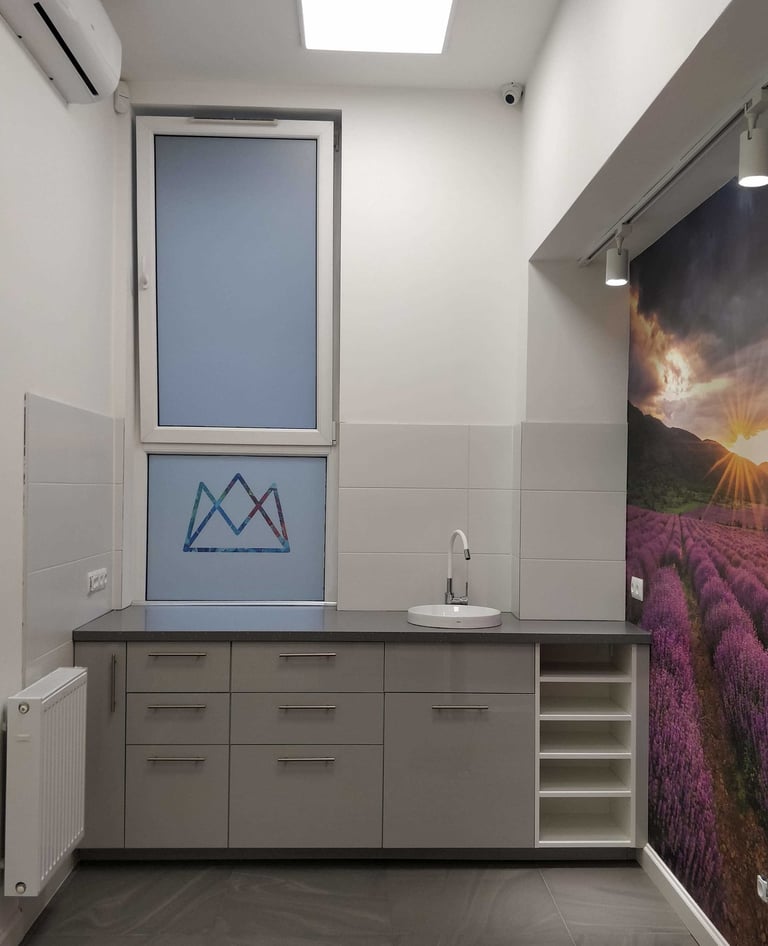 Najmniejszy gabinet w tym lokalu został przeznaczony dla podologa. Stylistyka każdego gabinetu jest podobna. Wyróżnia je jednak fototapa, w tym wypadku pola wrzosowe przy wschodzącym słońcu.