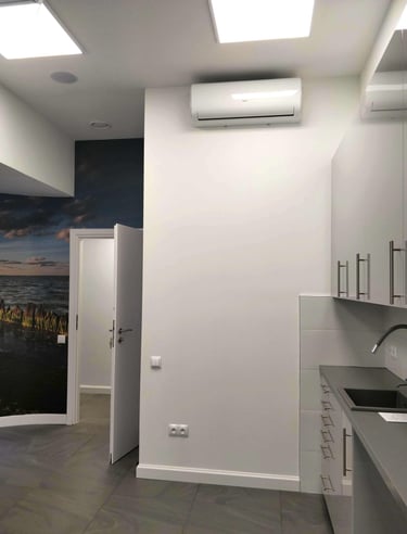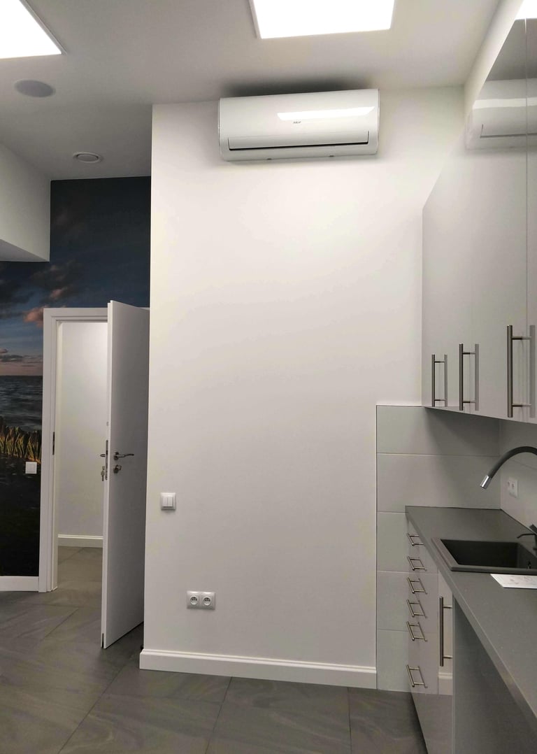 W obniżonym suficie zostały schowane wszystkie systemy klimatyzacji, rekuperacji itp. Oświetlenie panelami LEDowymi w barwie białej neutralnej 4000 kelvin przy 4500 lumenów każdy.