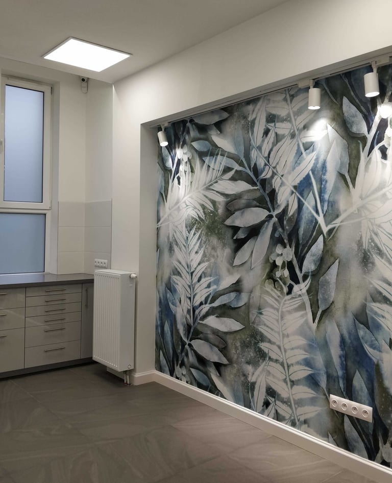 Kwiecista fototapeta ulokowana w niszy (obniżenie ze względu na konstrukcję lokalu) i doświetlona reflektorkami na szynach.