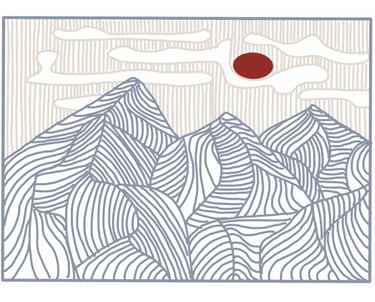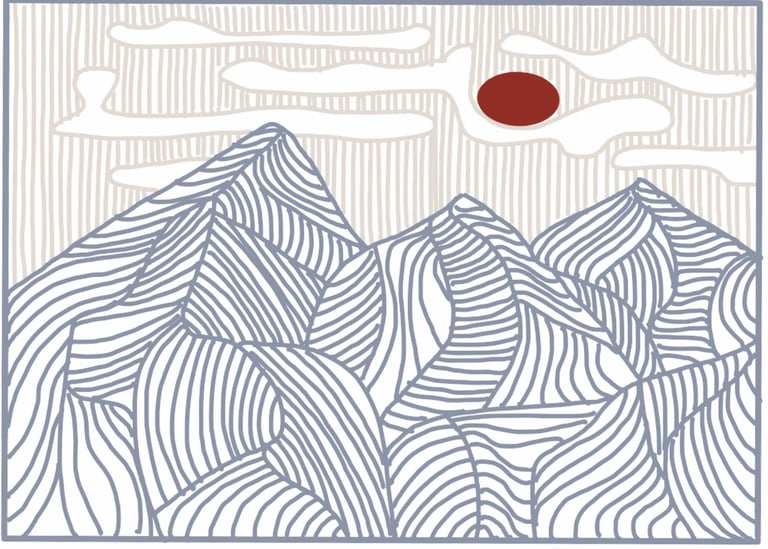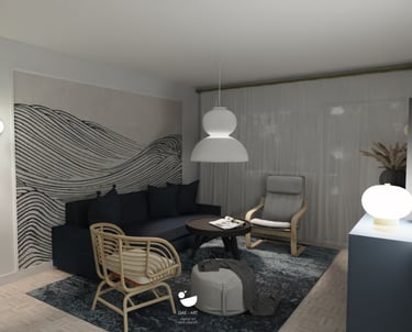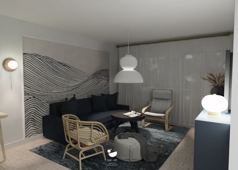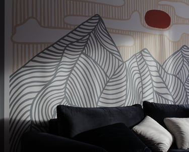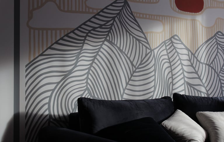 Liniowa ilustracja gór i nieba pasowała stylistycznie do projektowanego salonu gdzie zakupiona kanapa była granatowa, a ściana TV naprzeciwko ceglana. Kolory są delikatne i lekko zgaszone, żeby mural stanowił tło pokoju.