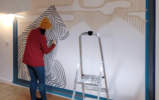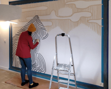 Malowidło ma wymiar 3mx 2,2m wysokości. Po wymierzeniu prostokąta na ścianie i zrobieniu ramki taśmą malarską, podzieliłam wszystko na 6 mniejszych prostokątych. Taki sam podział zrobiłam na wydrukowanej grafice, żeby mieć odniesienie. Na ścianę naniosłam zarys muralu ołówkiem. Używając jednego pędzla malarskiego i 3 kolorów z próbnika Sigmy, odwzorowałam grafikę wcześniej stworzoną na tablecie.